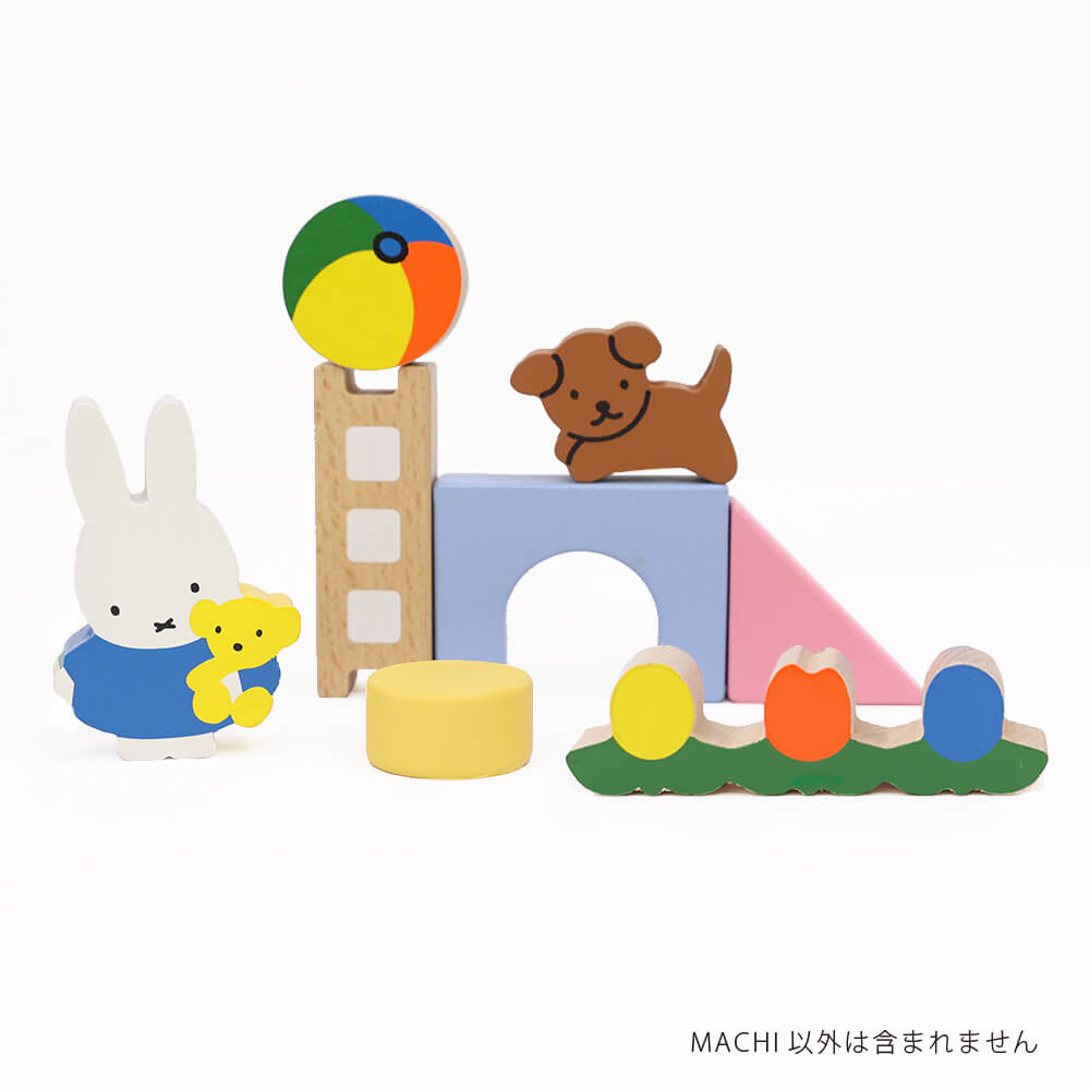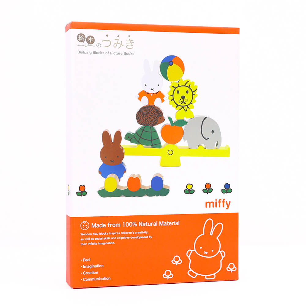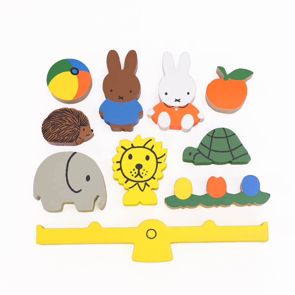 内容積み木10個(ミッフィー・メラニー・ライオン・ゾウ・はりねずみ・カメ・ボール・りんご・お花・シーソー)、リーフレット