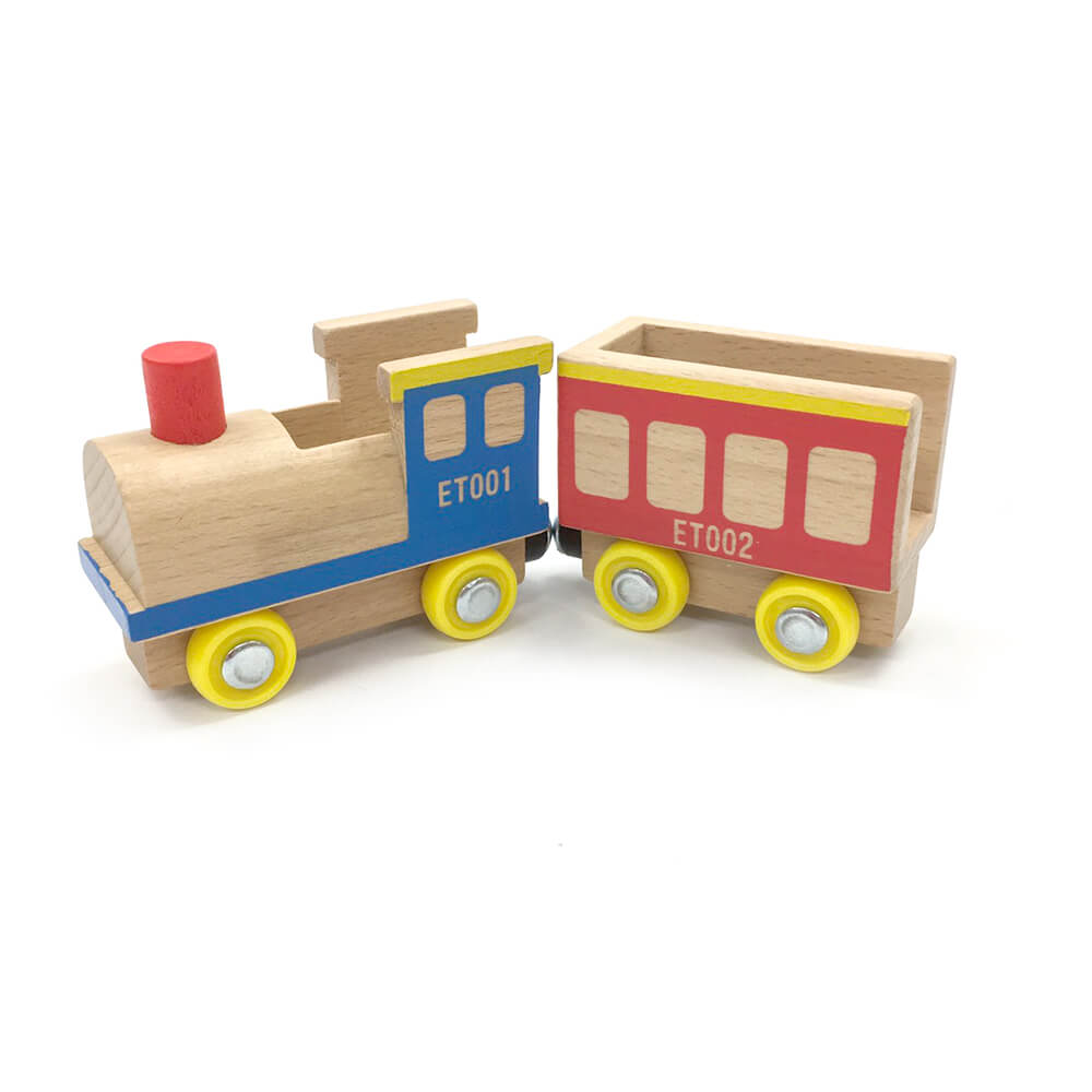 素材本体(天然木 ブナ)、車軸(鉄)、連結部(ナイロン・磁石)、車輪(PP)