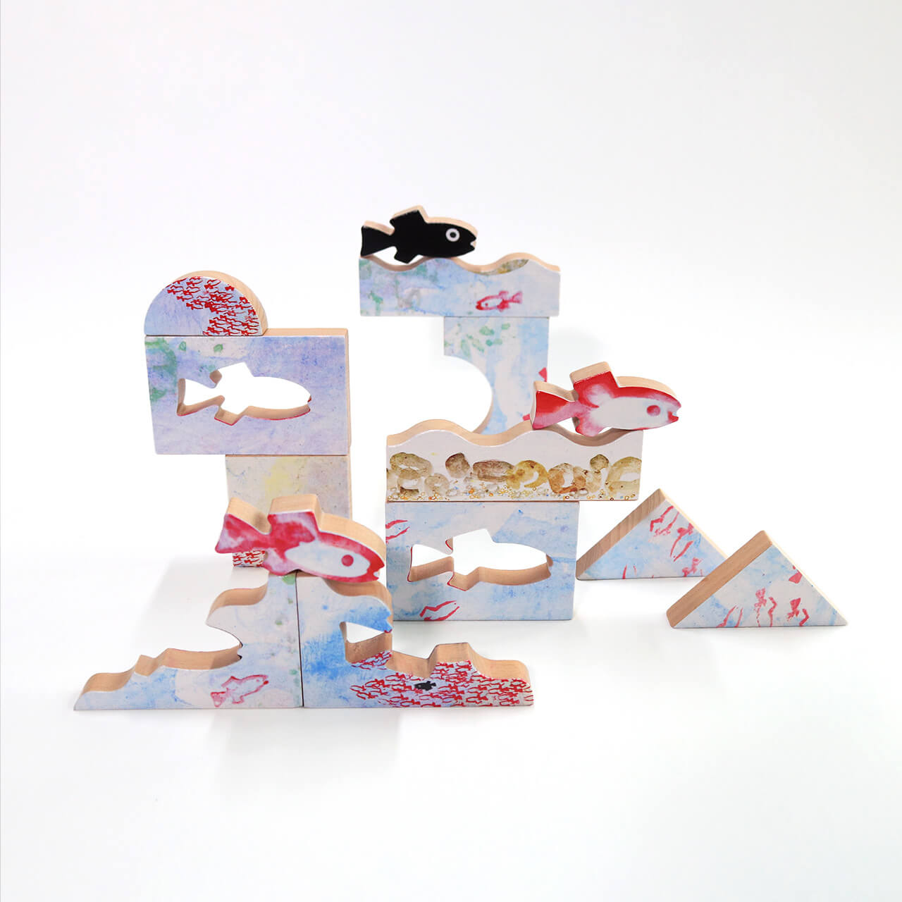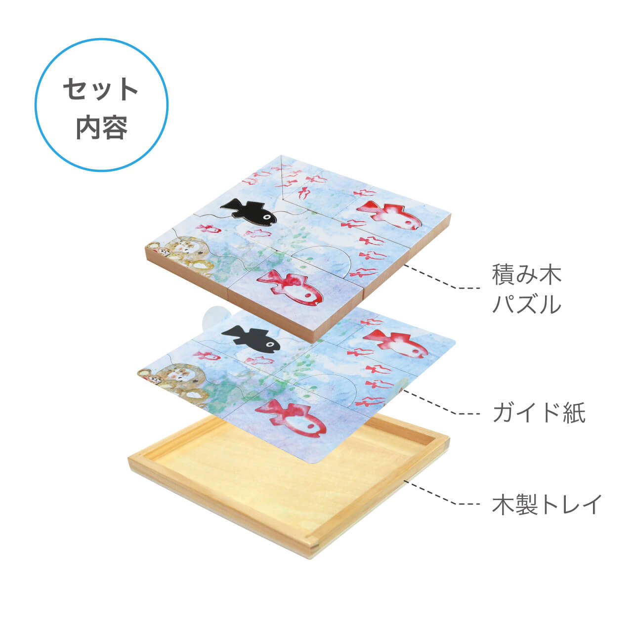 | 内容 | 積み木14個(魚3個含む)、木製トレイ、ガイド紙、リーフレット |